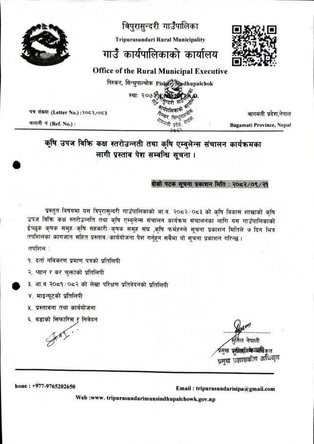 » कृषि उपज विक्रि कक्ष स्तरोउन्नती तथा कृषि एम्बुलेन्स संचालन कार्यक्रमका लागि प्रस्ताव पेश सम्बन्धि सूचना ।