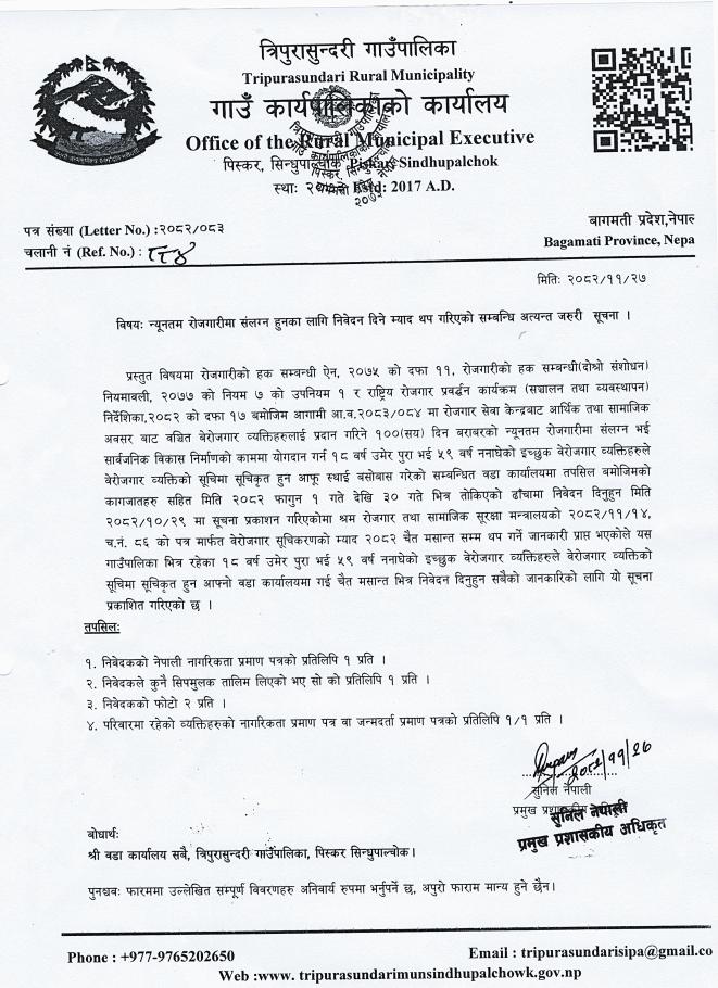 न्यूनतम रोजगारीमा संलग्न हुनका लागि निवेदन दिने म्याद थप गरिएको सम्बन्धी अत्यन्त जरुरी सूचना।