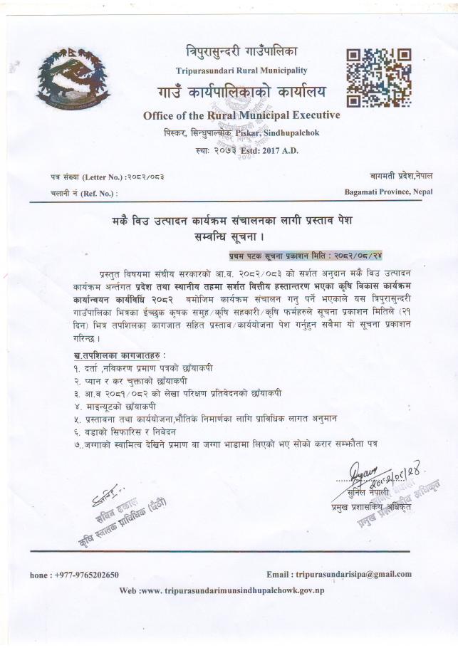 » मकै विउ उत्पादन कार्यक्रम सञ्चालनका लागि प्रस्ताव पेश गर्ने सम्बन्धी सूचना।