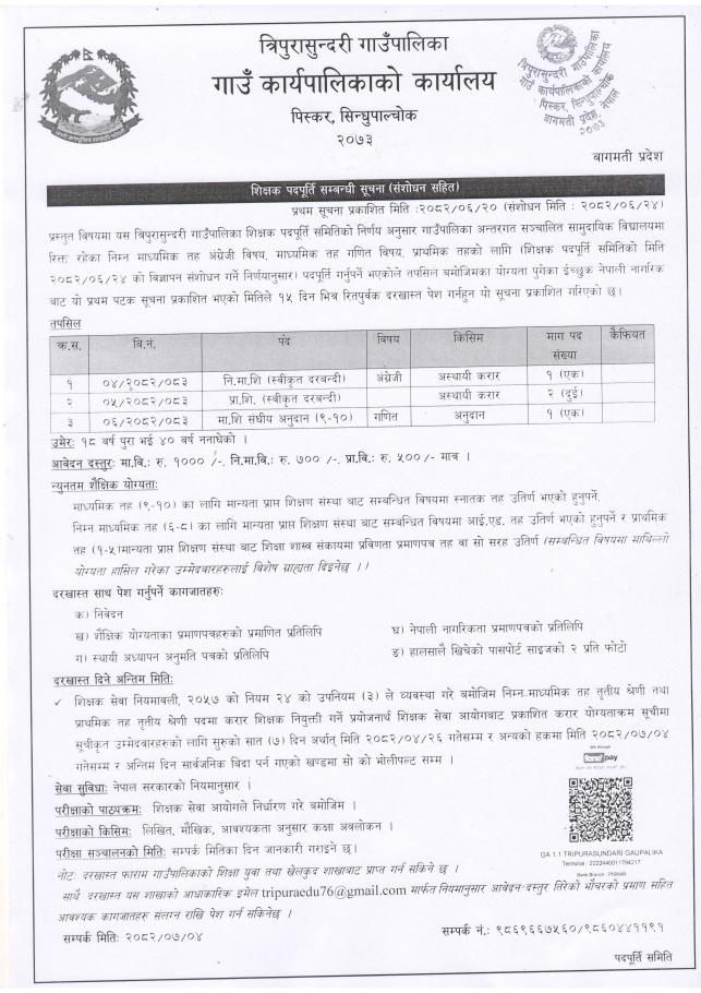 शिक्षक पदपूर्ति सम्बन्धी सूचना ( संशोधन सहित)