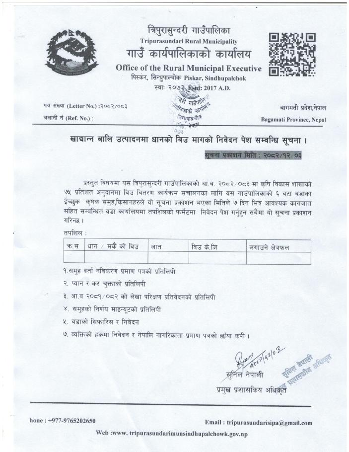 खाद्यन्न बाली उत्पादन धानको विउ मागको निवेदन सम्बन्धी सूचना ।