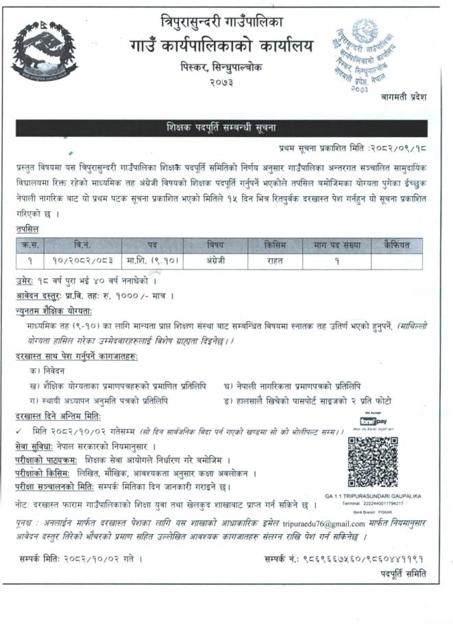 शिक्षक पदपूर्ति सम्बन्धी सूचना ।