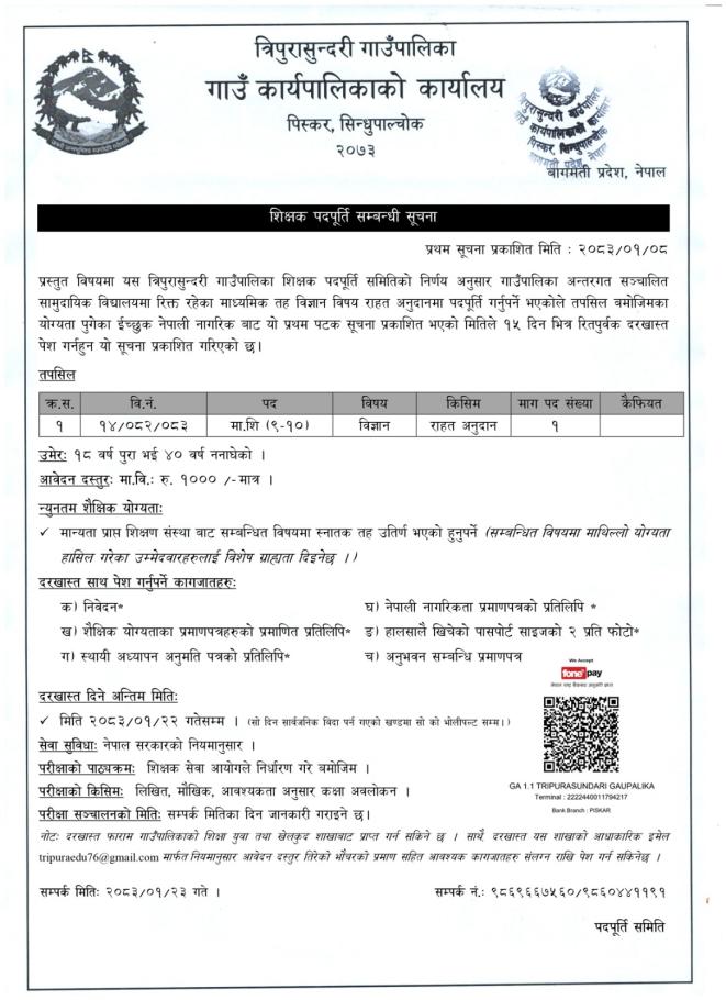 शिक्षक पदपूर्ति सम्बन्धी सूचना ।